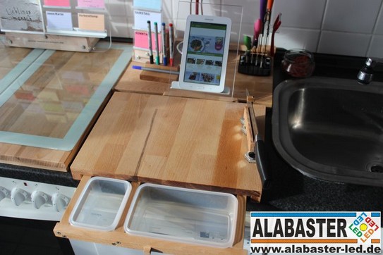 Das Brett sollte auch einen Halter für ein Tablet bekommen, auf dem man sich evtl. Re-